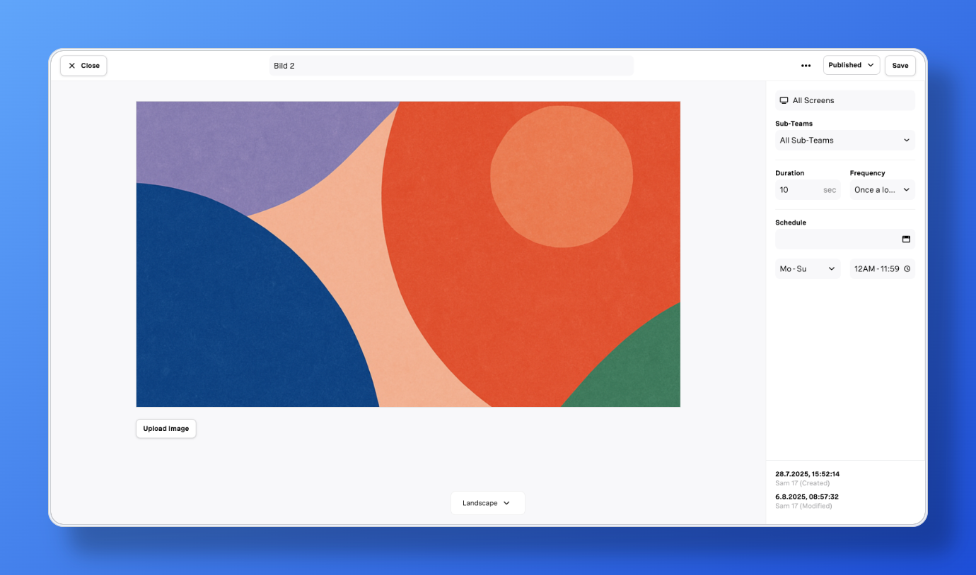 With the Picture app From LobbySpace, you can easily upload your photos or graphics and stage them. Whether it's high-resolution product images, inspiring visuals or background images — your content appears razor-sharp and in the right size on every display — automatically scaled and optimized.