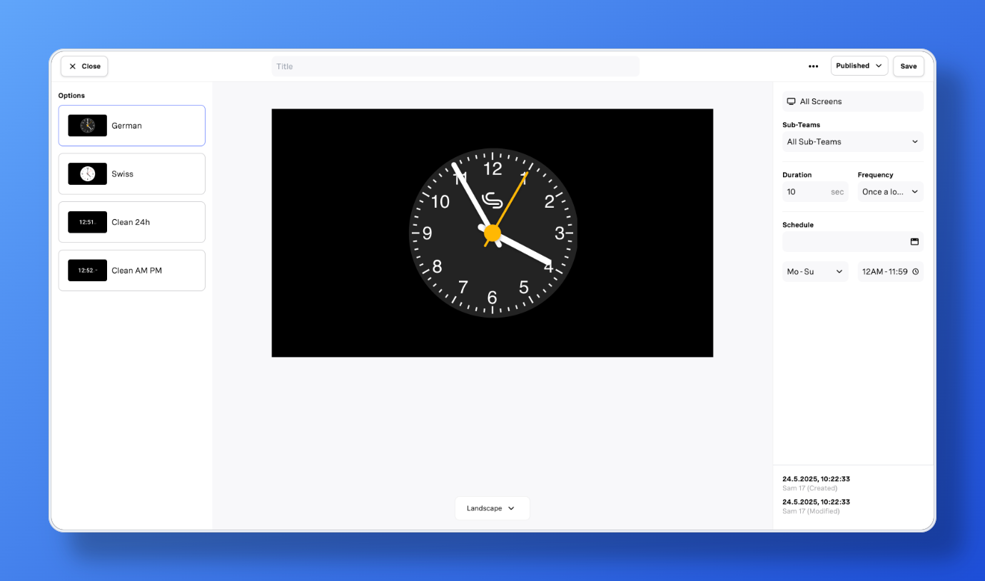 With the LobbySpace time app, you can show exact times (analog or digital) — clearly designed, easy to read, synchronized at any time.