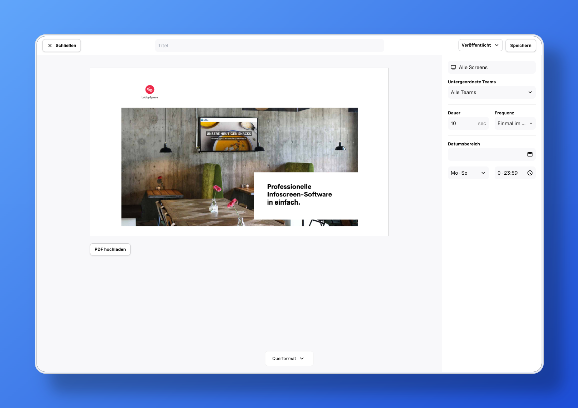 Ideal, um Broschüren, Speisekarten, Anleitungen oder Reports digital auszustellen. Die PDF-App rendert Ihre Dokumente auf Displays und optimiert diese automatisch.