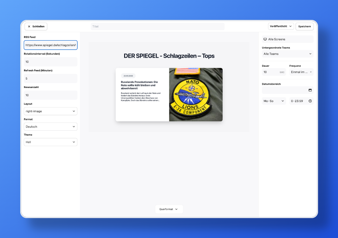 Unsere RSS-Feed-App ermöglicht Ihnen, Inhalte aus Blogs, Newsportalen oder Fachseiten direkt einzuspielen. Kein Mehraufwand – Inhalte erscheinen sofort, sobald sie veröffentlicht sind.